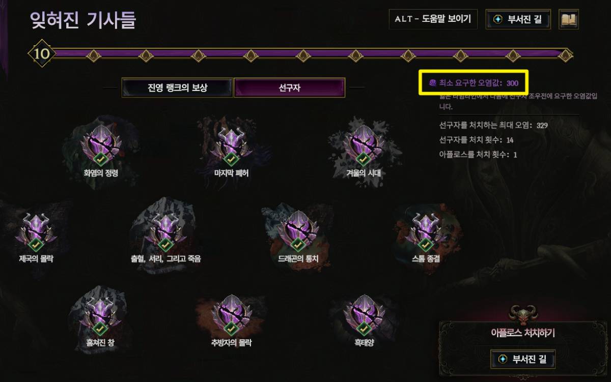 잊혀진 기사들 UI 오른쪽에서 최소 오염도 이상에서 처치해야한다